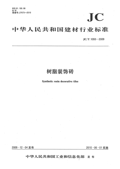 JC/T 1093-2009树脂装饰砖Synthetic resin decorative tiles