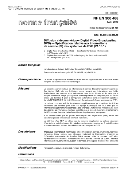 NF EN 300468-2020 Digital Video Broadcasting (DVB) - Specification for Service Information (SI) in DVB systems (V1.16.1)