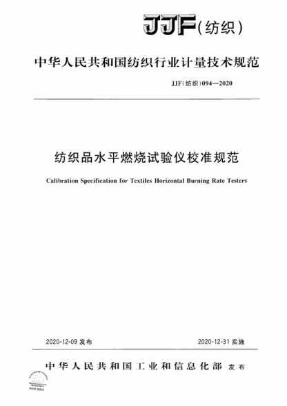 JJF (纺织) 094-2020 纺织品水平燃烧试验仪校准规范 Calibration Specification for Textiles Horizontal Burning Rate Testers