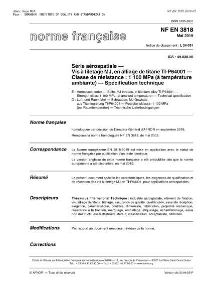 NF L24-031-2019 Aerospace series - Bolts, MJ threads, in titanium alloy TI-P64001 - Strength class : 1 100 MPa (at ambient temperature) - Technical specification