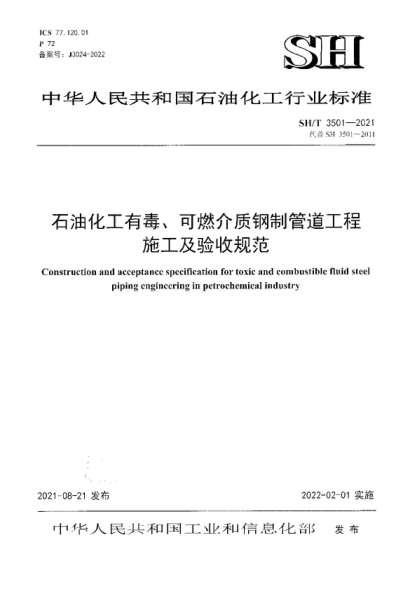 SH/T 3501-2021 雷竞技世界杯手机登录 化工有毒、可燃介质钢制管道工程施工及验收规范 Construction and acceptance specification for toxic and combustible fluid steel piping engineering in petrochemical industry